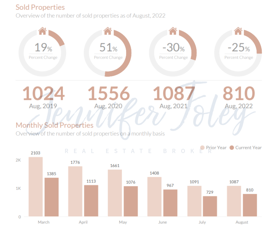 - August 2022- There were 810 sold properties, a 25.48% decrease from August, 2021