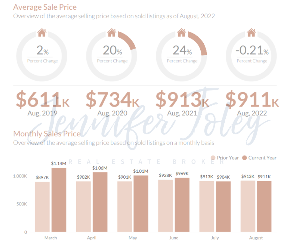 The average sales price in August, 2022 is $911K, a 0.21% decrease from August, 2021. The average sales price of August, 2021 was $913K. We have seen a year to date average sales price of $1.06M in 2022 and $904K in 2021 resulting in a 17.45% increase.