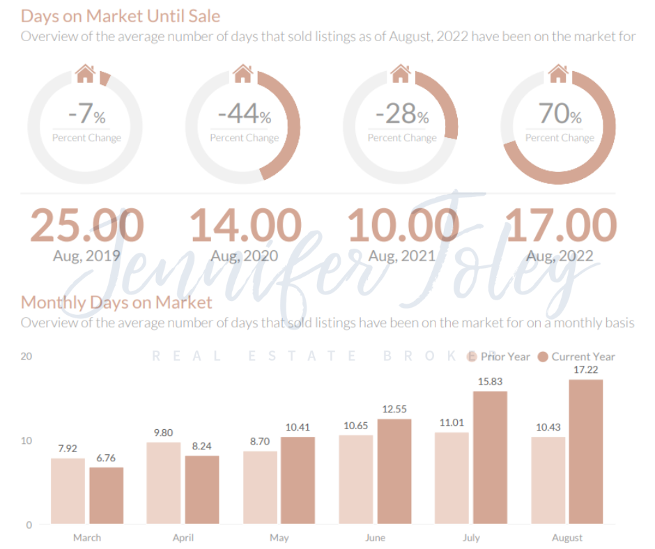 - August 2022- The average days on market was 17.00, a 70.00% increase from August, 2021