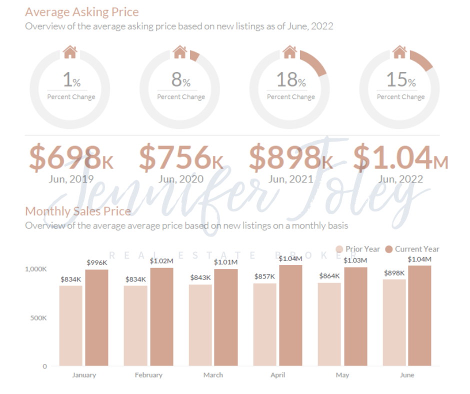 - June 2022 - The average asking price was $1.04M, a 15.76% increase from June, 2021.
