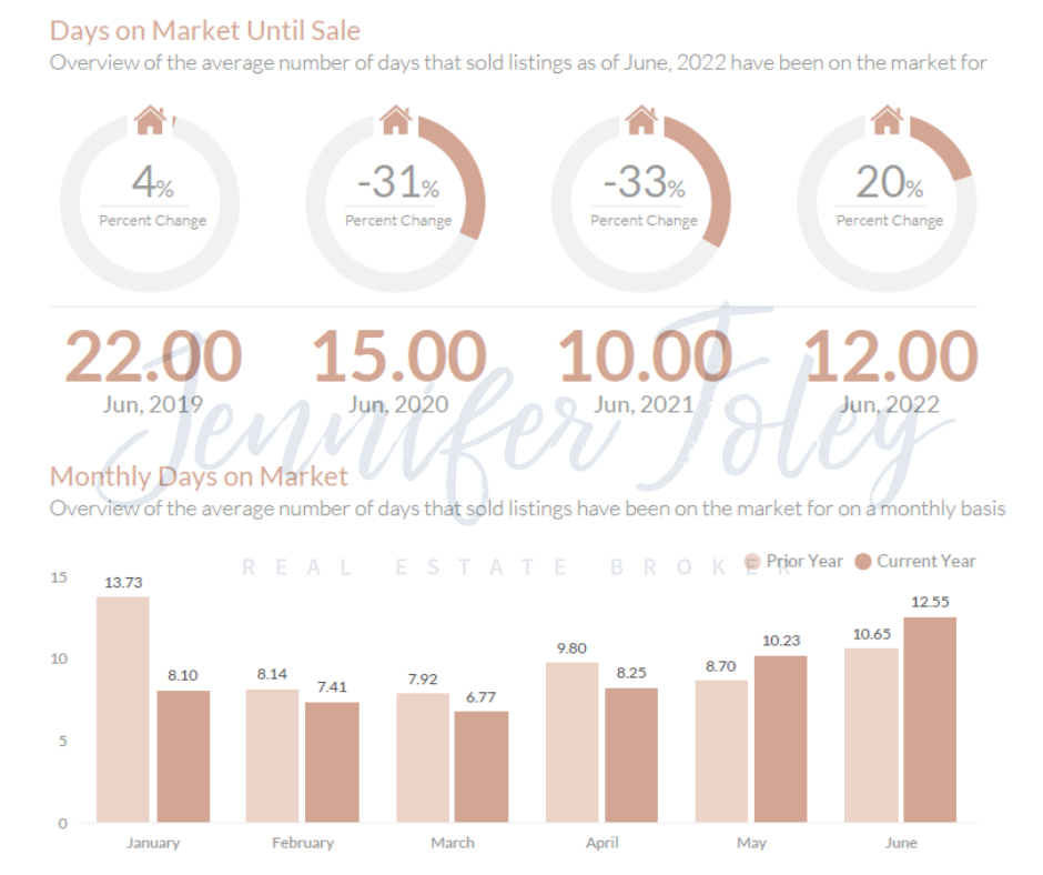 - June 2022 - The average days on market was 12.00, a 20.00% increase from June, 2021.