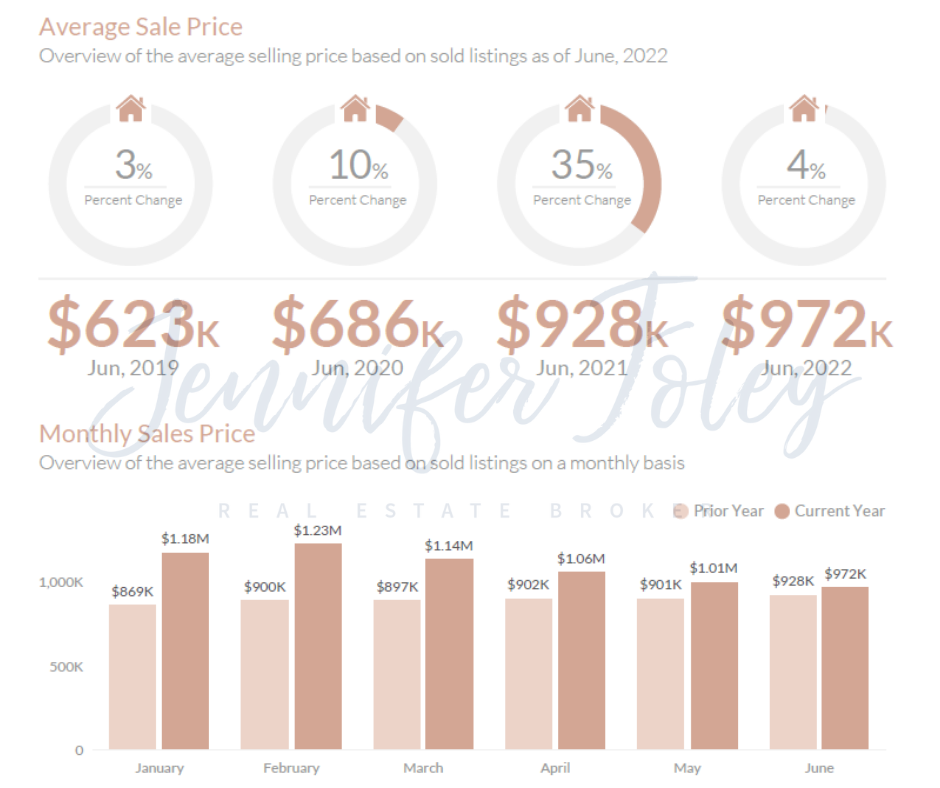 The average sales price in June, 2022 is $972K, a 4.75% increase from June, 2021. The average sales price of June, 2021 was $928K. We have seen a year to