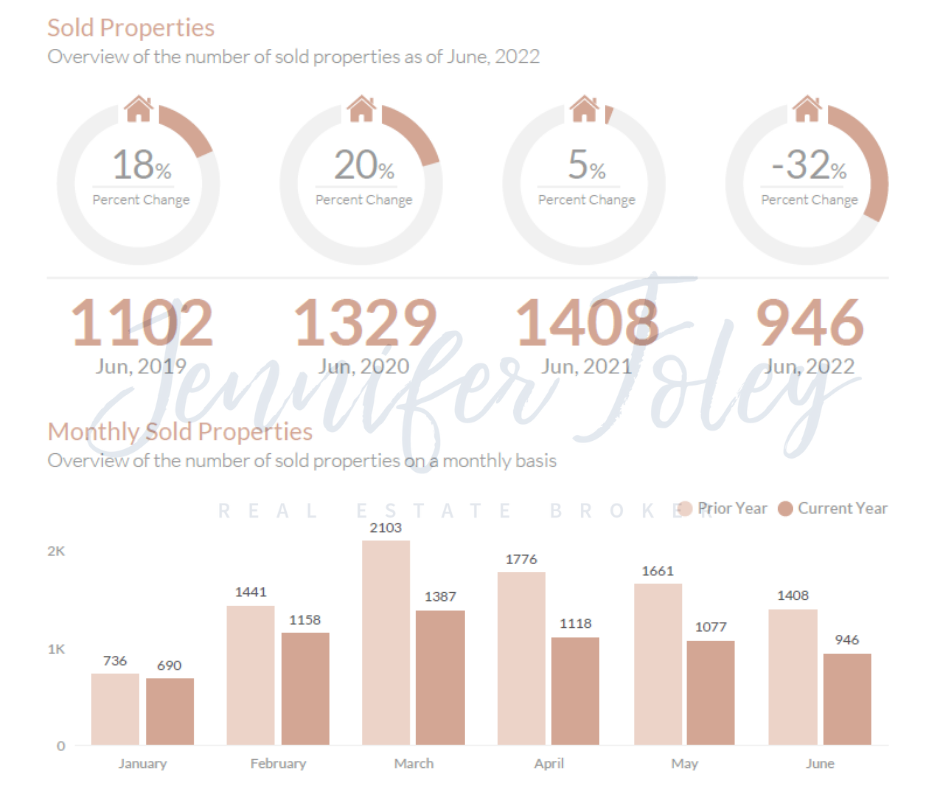 In June, 2022, we have seen a total volume of 946 sold properties which has resulted in a 32.81% decrease from June, 2021 in which 1408 listings were sold; We have