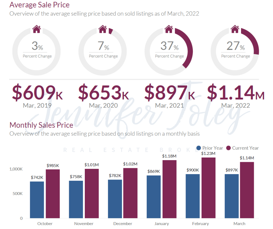 - March 2022: The average sales price was $1.14M, a 27.15% increase from March 2021