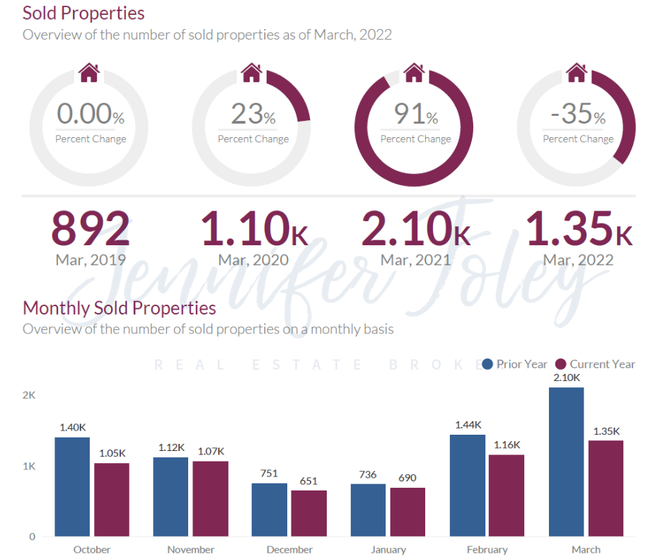 - March 2022: There were 1.35K sold properties, a 35.76% decrease from March 2021